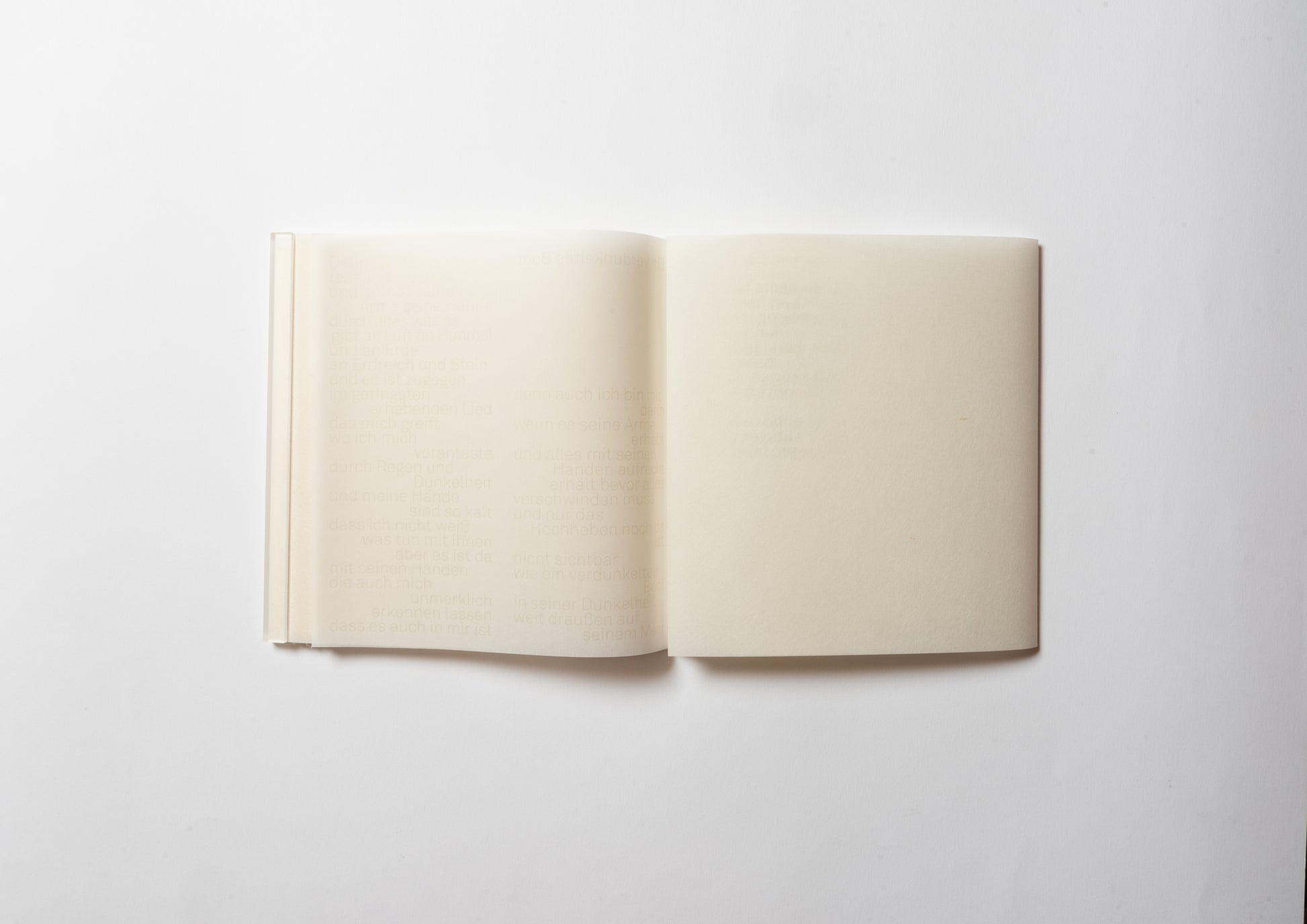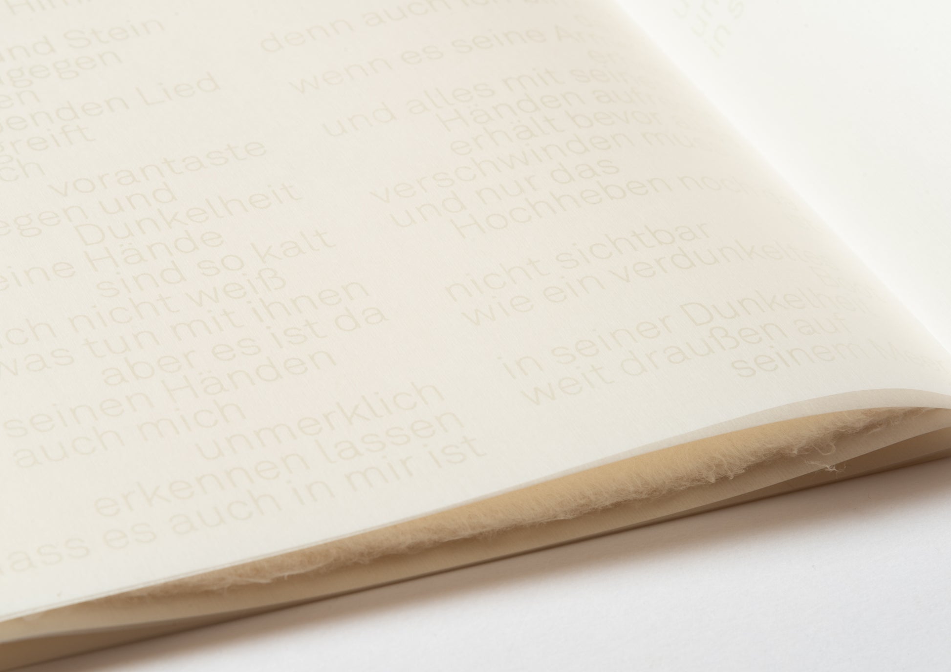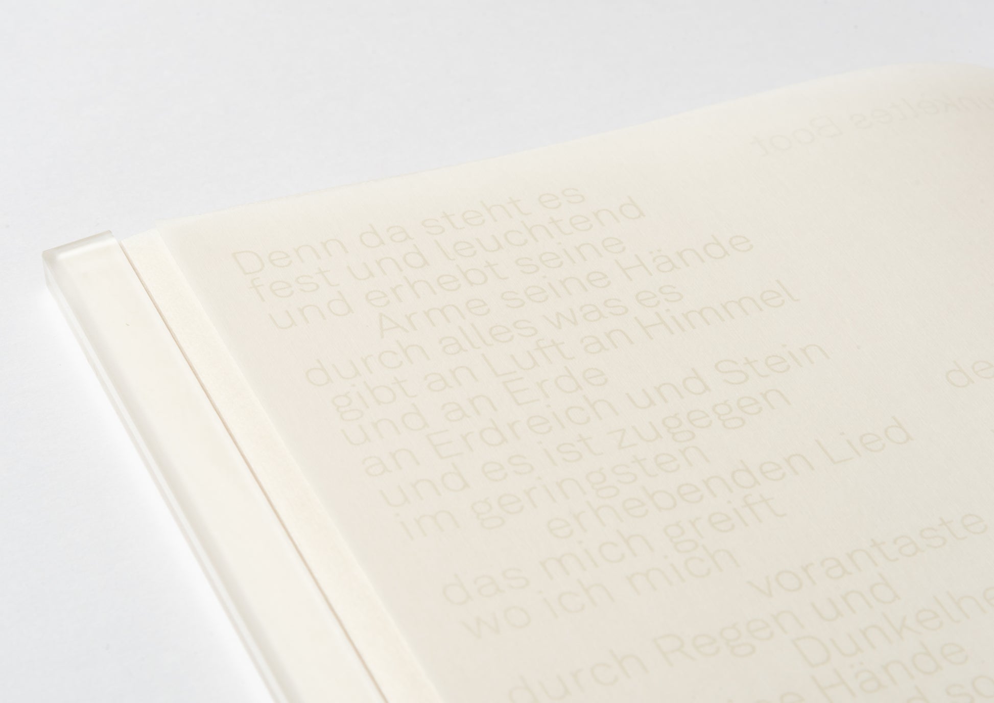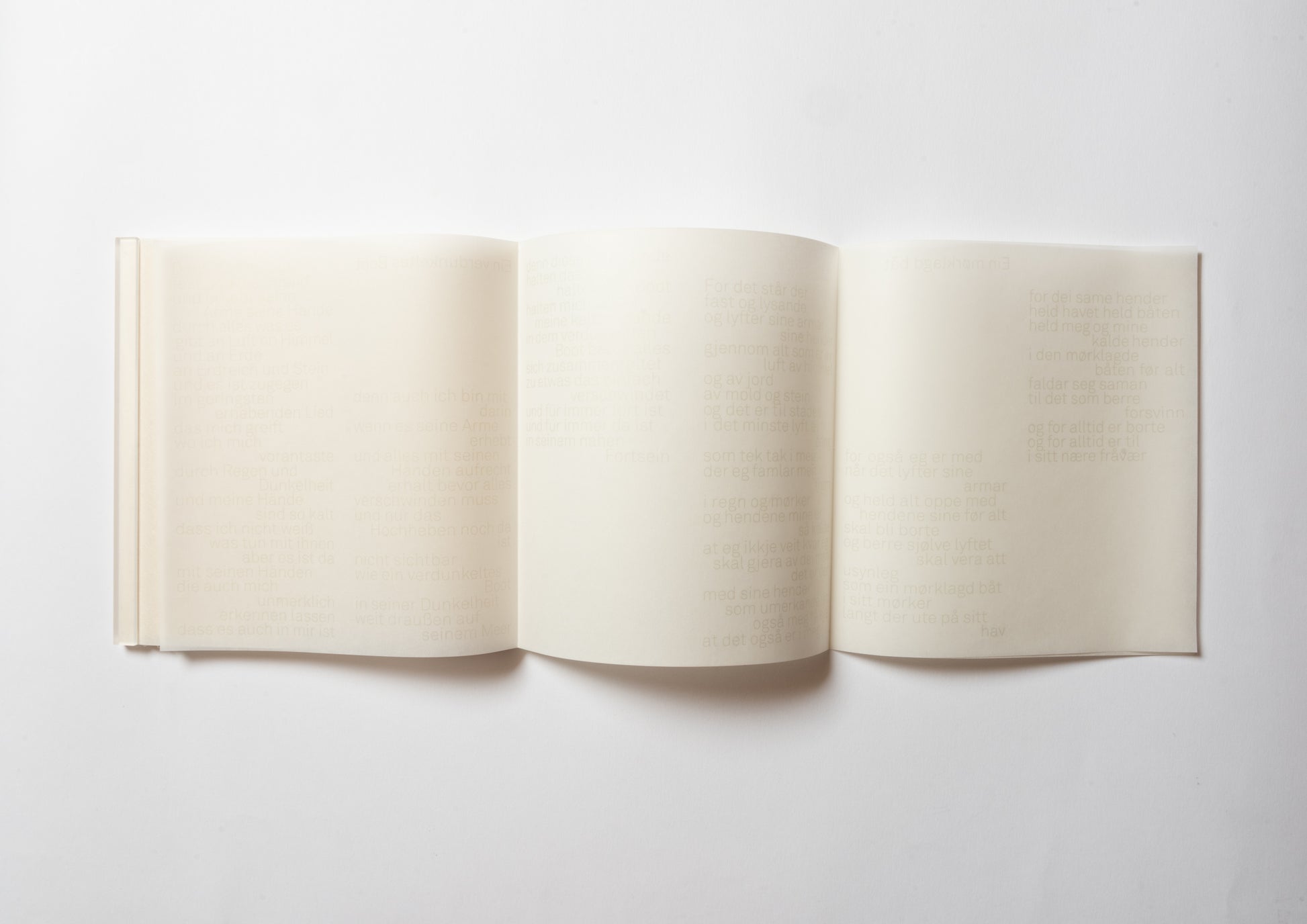 桐箱の蓋を開けると、上等な和菓子のような、白く嫋やかな姿をした本が姿をあらわす。直線の集合体にも関わらず、やわらかい肌身を感じさせる。あとで、それが紙そのものの重力が作り出す曲線によるものだと気づいた。1ページ目をめくるとヨン・フォッセの一遍の詩「A Darkened Boat / くらい舟」が、ニーノシュク語とドイツ語で刻まれている。しっかりとした厚みのある透明感のある紙に浮き上がる文字は、さざなみに漂う小さなボートのようでもある。