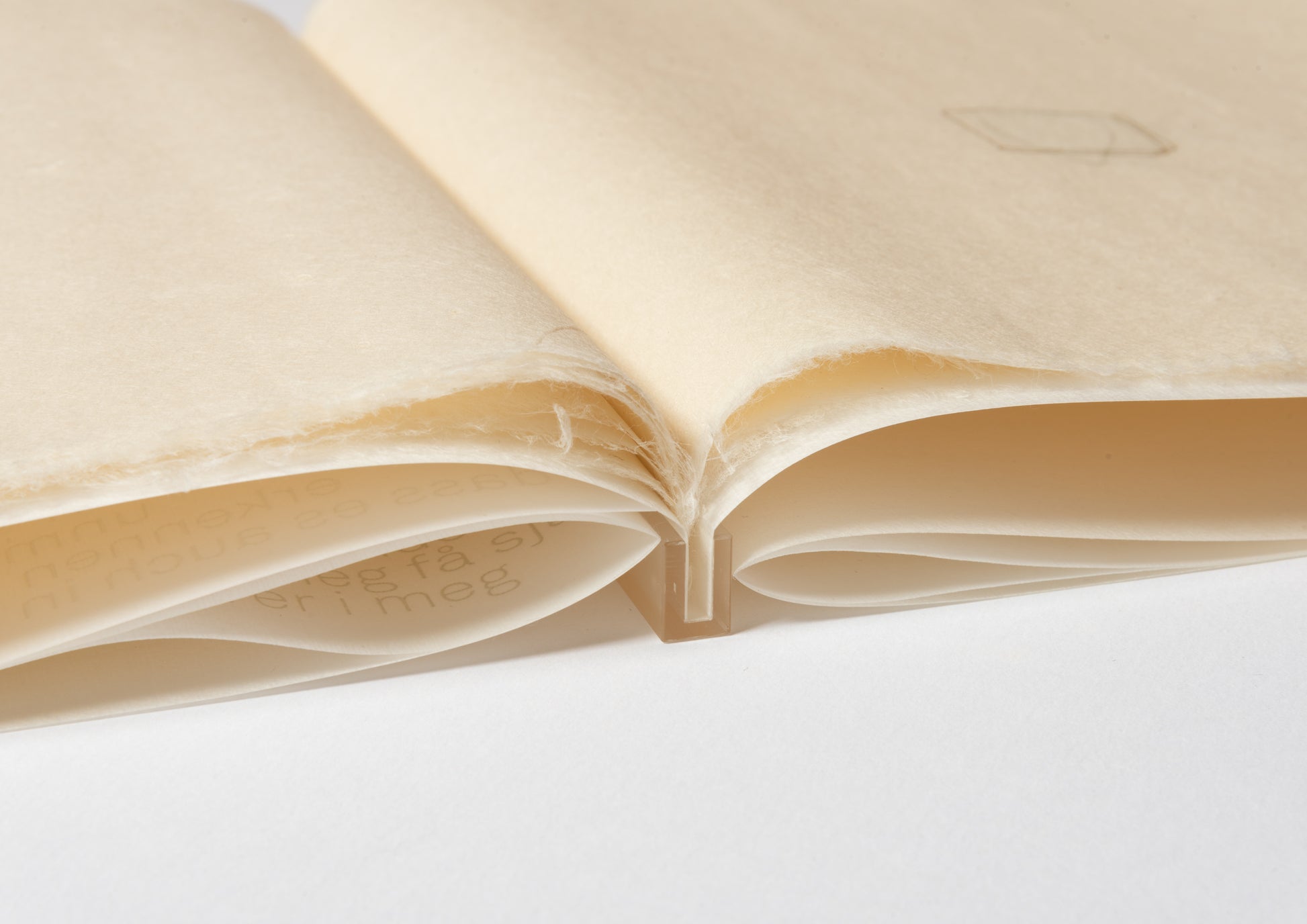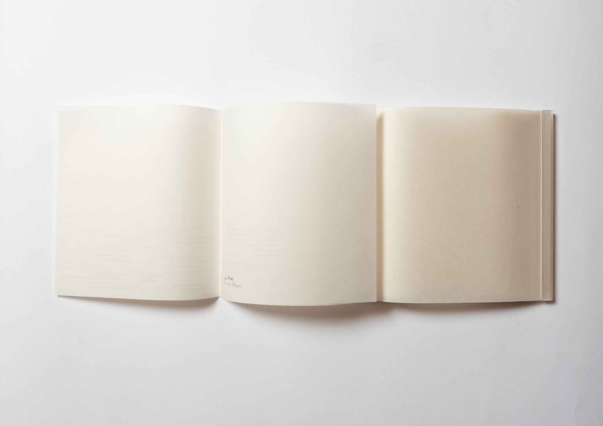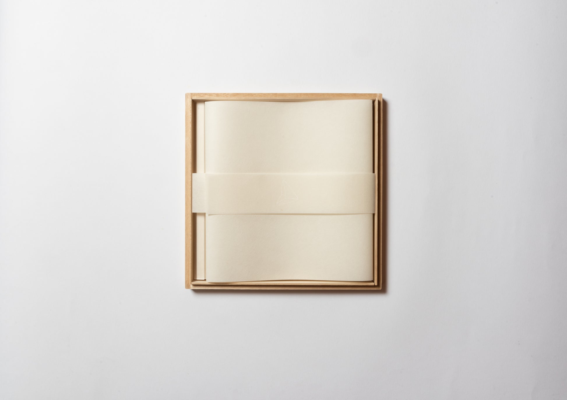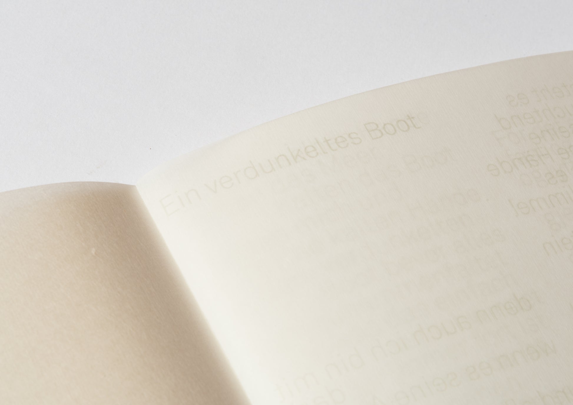 桐箱の蓋を開けると、上等な和菓子のような、白く嫋やかな姿をした本が姿をあらわす。直線の集合体にも関わらず、やわらかい肌身を感じさせる。あとで、それが紙そのものの重力が作り出す曲線によるものだと気づいた。1ページ目をめくるとヨン・フォッセの一遍の詩「A Darkened Boat / くらい舟」が、ニーノシュク語とドイツ語で刻まれている。しっかりとした厚みのある透明感のある紙に浮き上がる文字は、さざなみに漂う小さなボートのようでもある。
