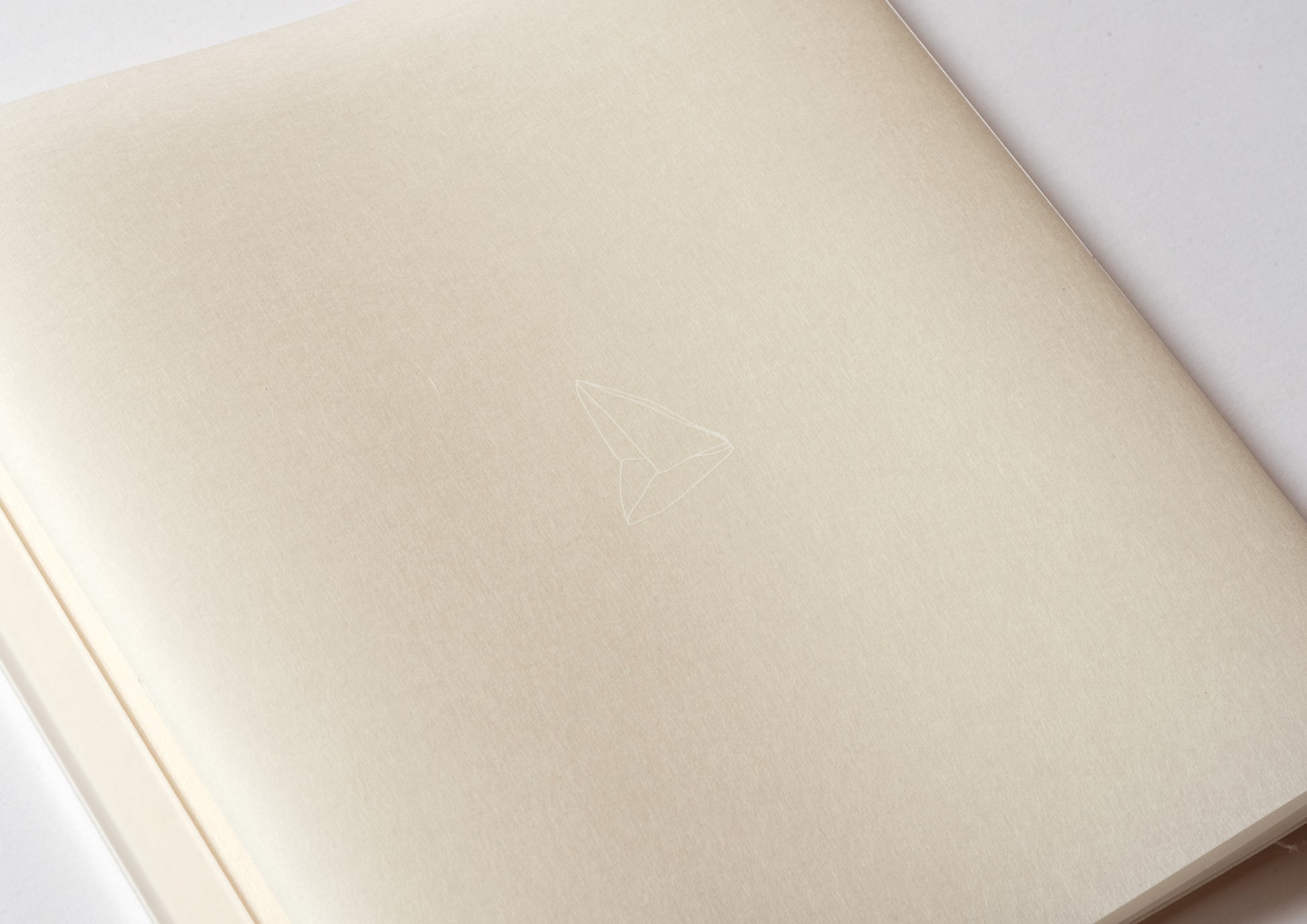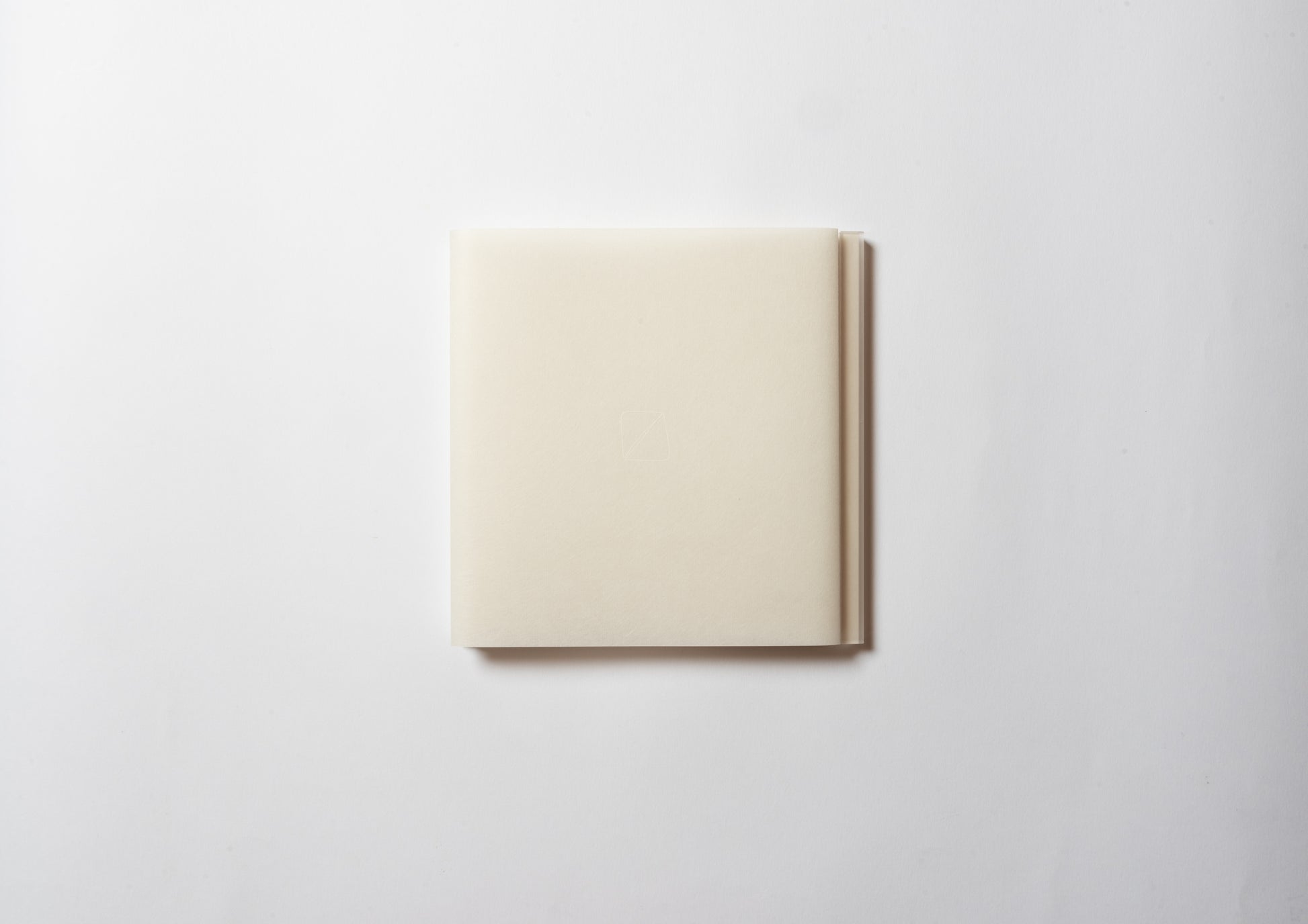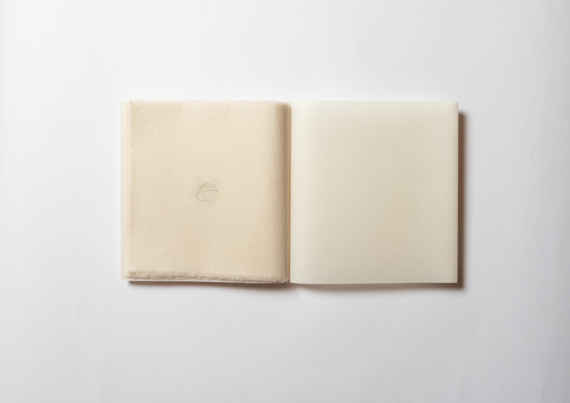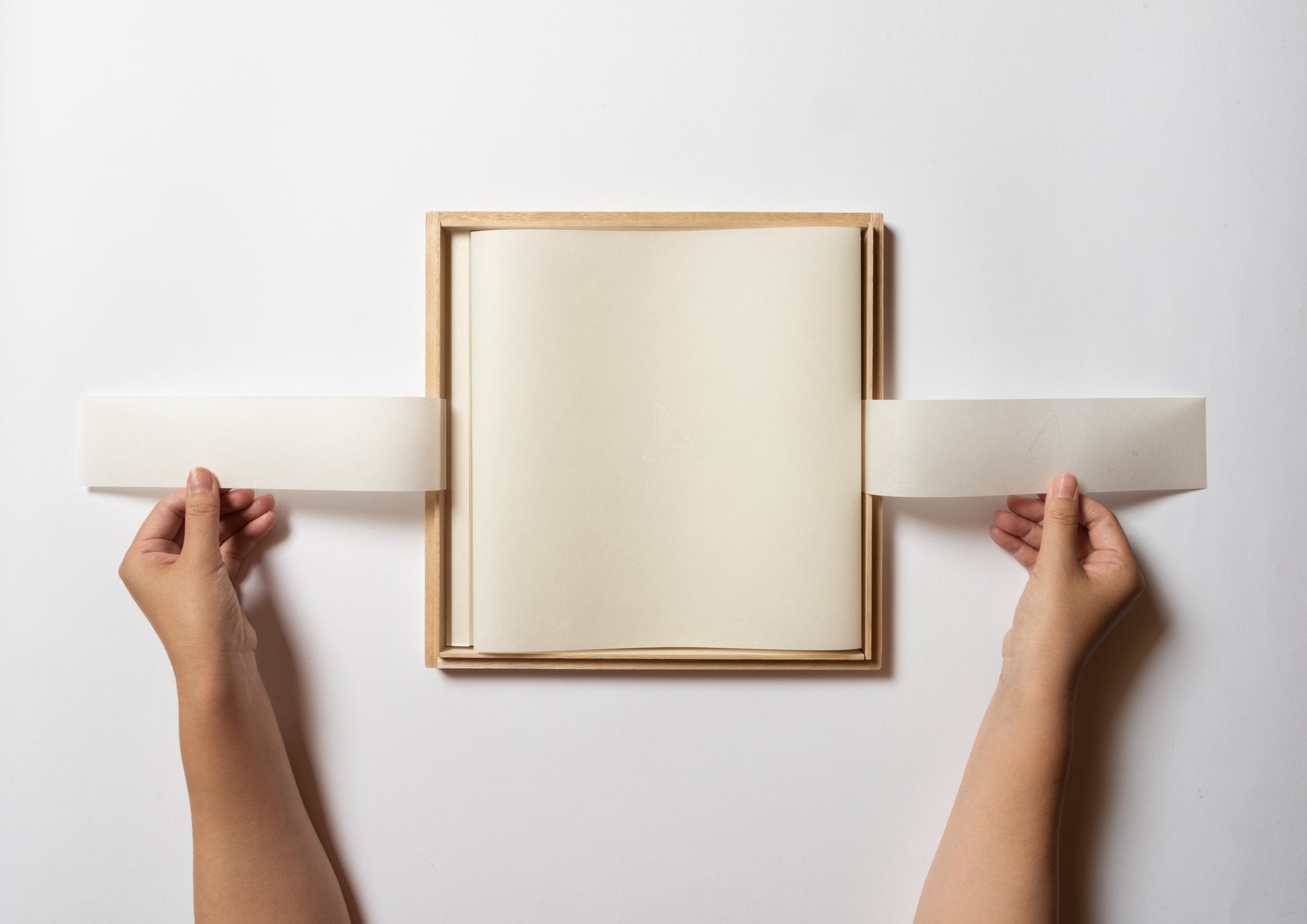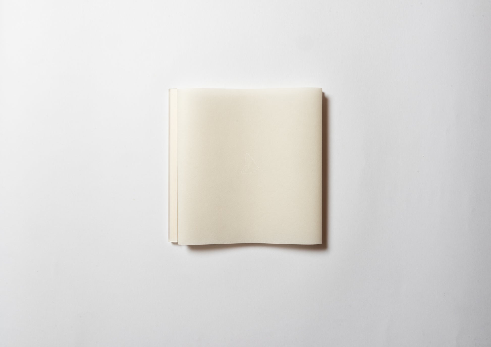 桐箱の蓋を開けると、上等な和菓子のような、白く嫋やかな姿をした本が姿をあらわす。直線の集合体にも関わらず、やわらかい肌身を感じさせる。あとで、それが紙そのものの重力が作り出す曲線によるものだと気づいた。1ページ目をめくるとヨン・フォッセの一遍の詩「A Darkened Boat / くらい舟」が、ニーノシュク語とドイツ語で刻まれている。しっかりとした厚みのある透明感のある紙に浮き上がる文字は、さざなみに漂う小さなボートのようでもある。