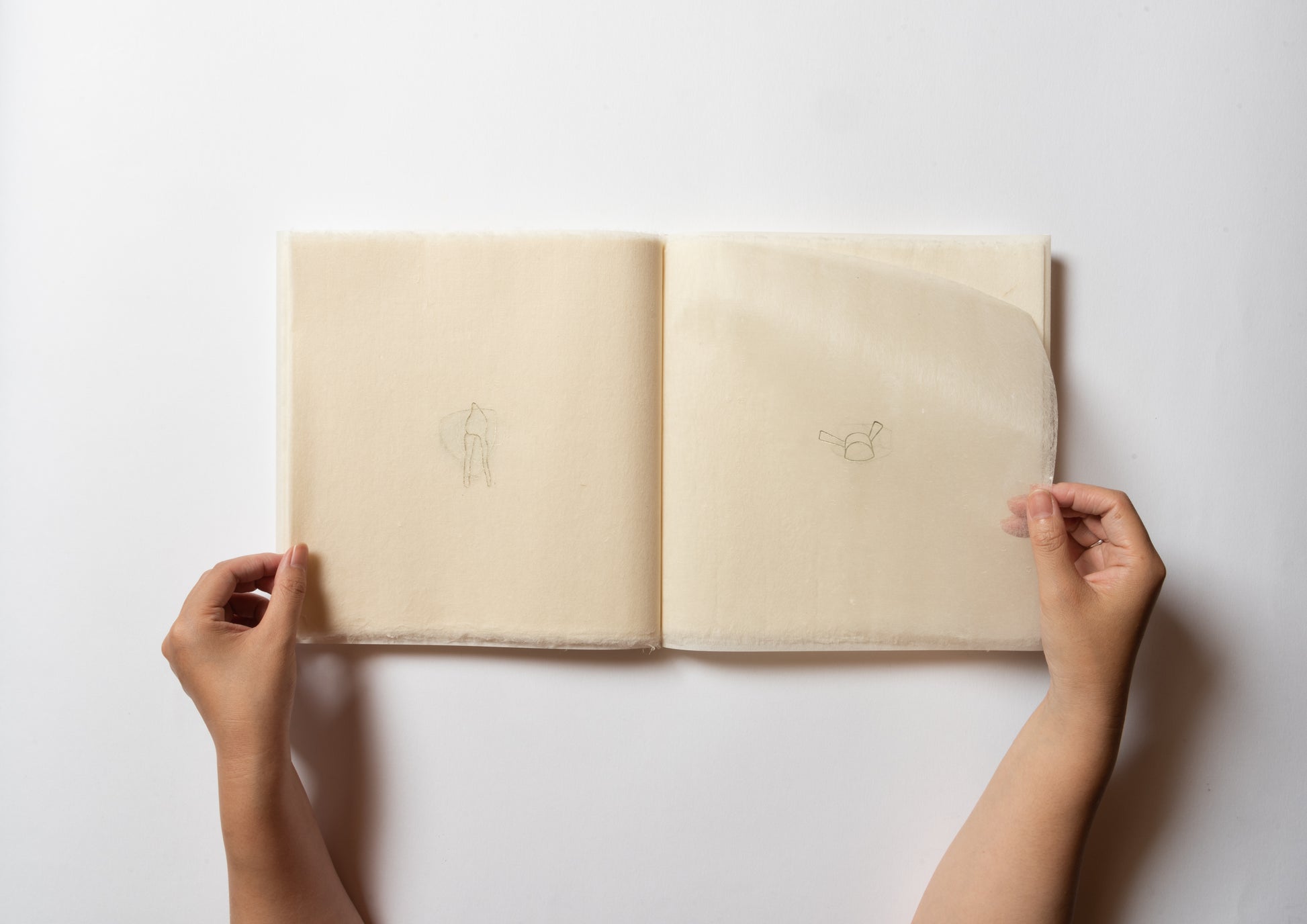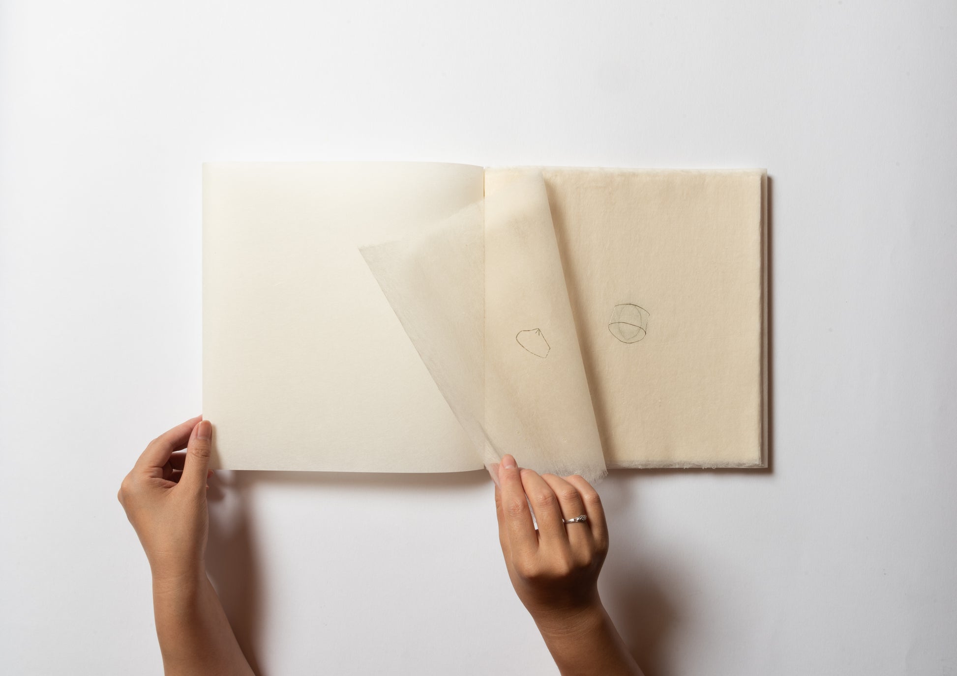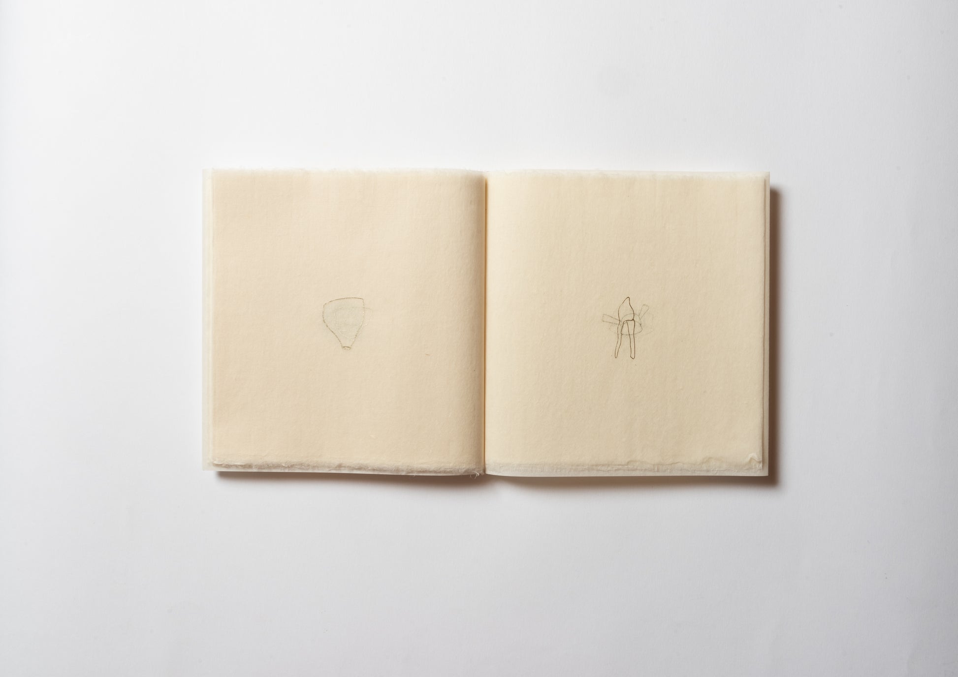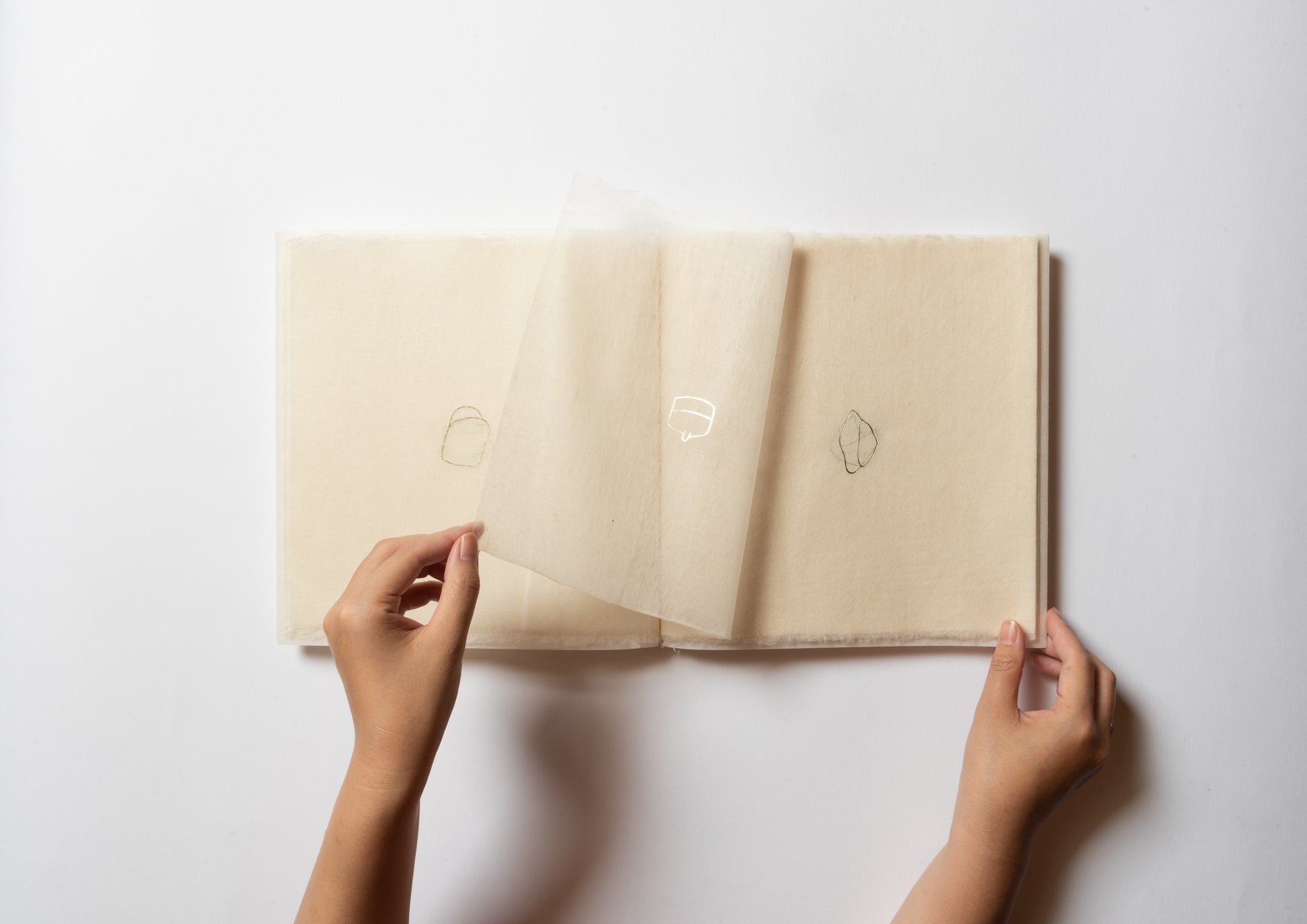 桐箱の蓋を開けると、上等な和菓子のような、白く嫋やかな姿をした本が姿をあらわす。直線の集合体にも関わらず、やわらかい肌身を感じさせる。あとで、それが紙そのものの重力が作り出す曲線によるものだと気づいた。1ページ目をめくるとヨン・フォッセの一遍の詩「A Darkened Boat / くらい舟」が、ニーノシュク語とドイツ語で刻まれている。しっかりとした厚みのある透明感のある紙に浮き上がる文字は、さざなみに漂う小さなボートのようでもある。