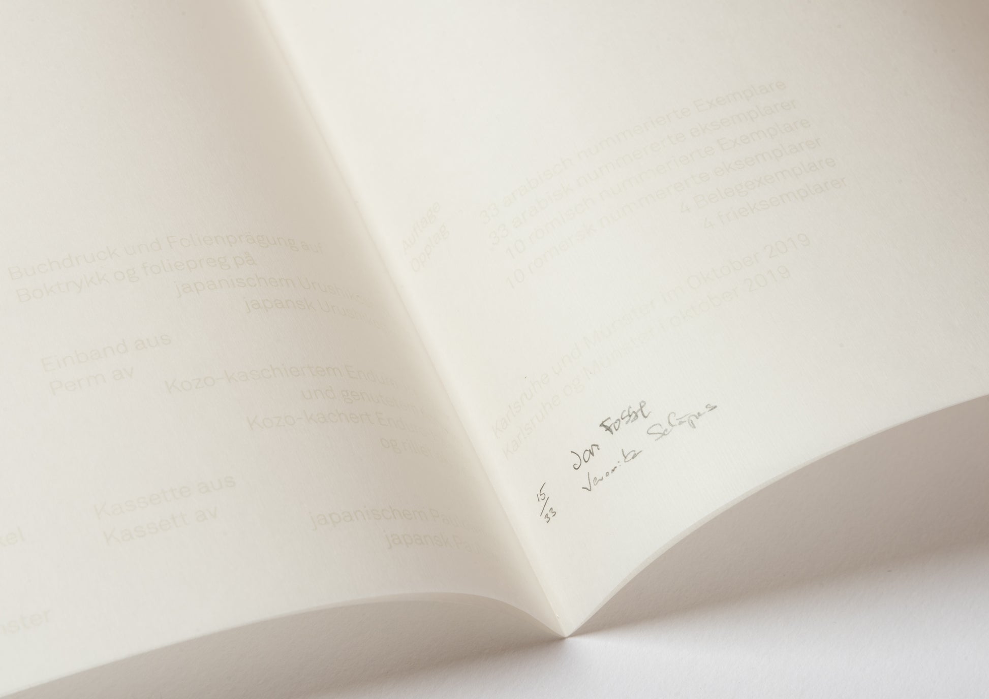 - 33 copies with consecutive Arabic numerals on Urushikoshi paper K93. 10 copies with consecutive Roman numerals on Urushikoshi K141 and 4 sample copies. / 33部は漆濾紙K93にアラビア数字の連番、10部は漆濾紙K141にローマ数字連番、サンプル4部
