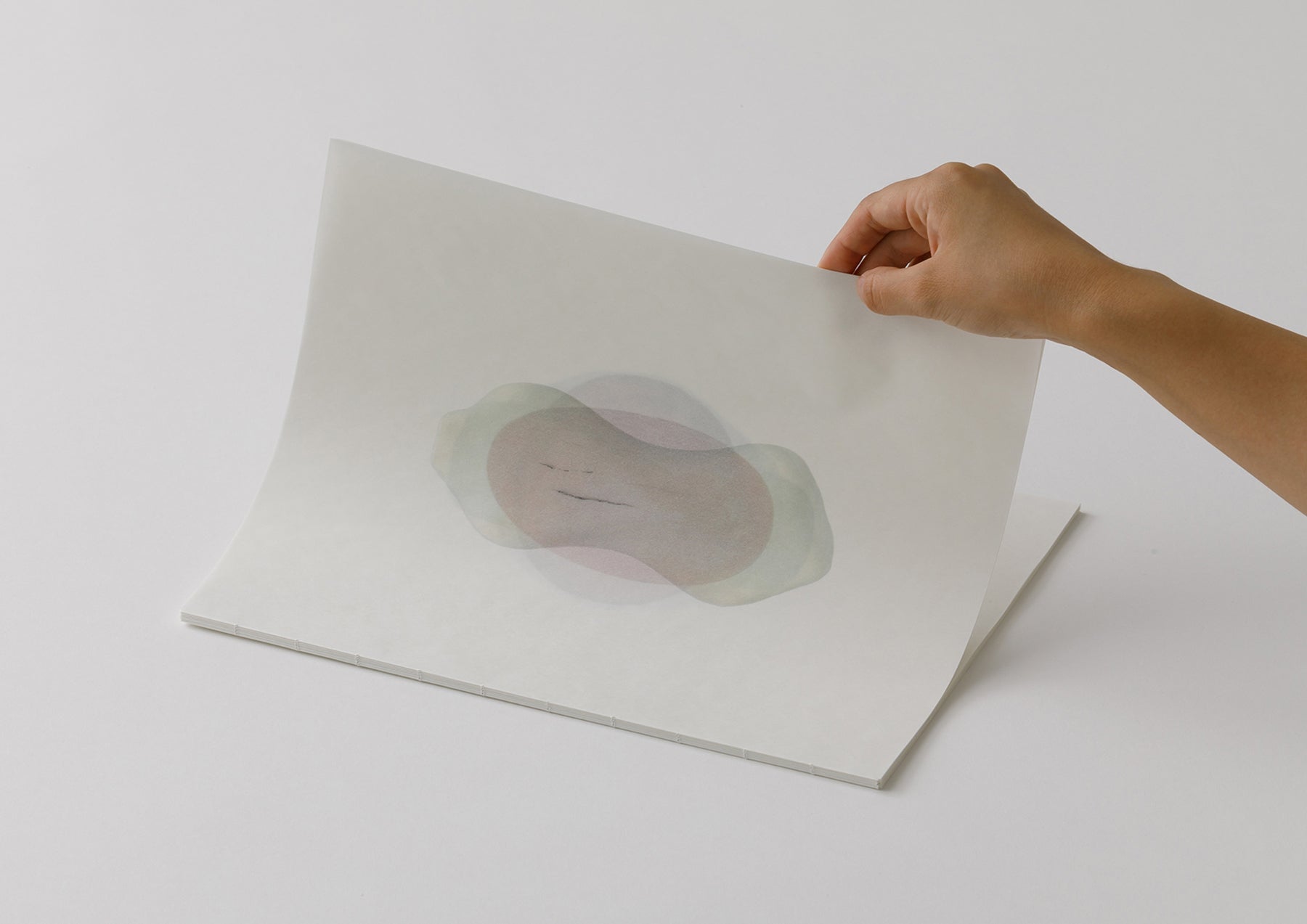 タイトルは「echo(エコー)」といいます。100部限定のエディションです。かつて石鹸を包んでいた薬包紙のようなぬらっとしたワックスペーパーに印刷し、それを製本家の都筑晶絵さんが列帖装という方法で一冊ずつていねいに製本しています。