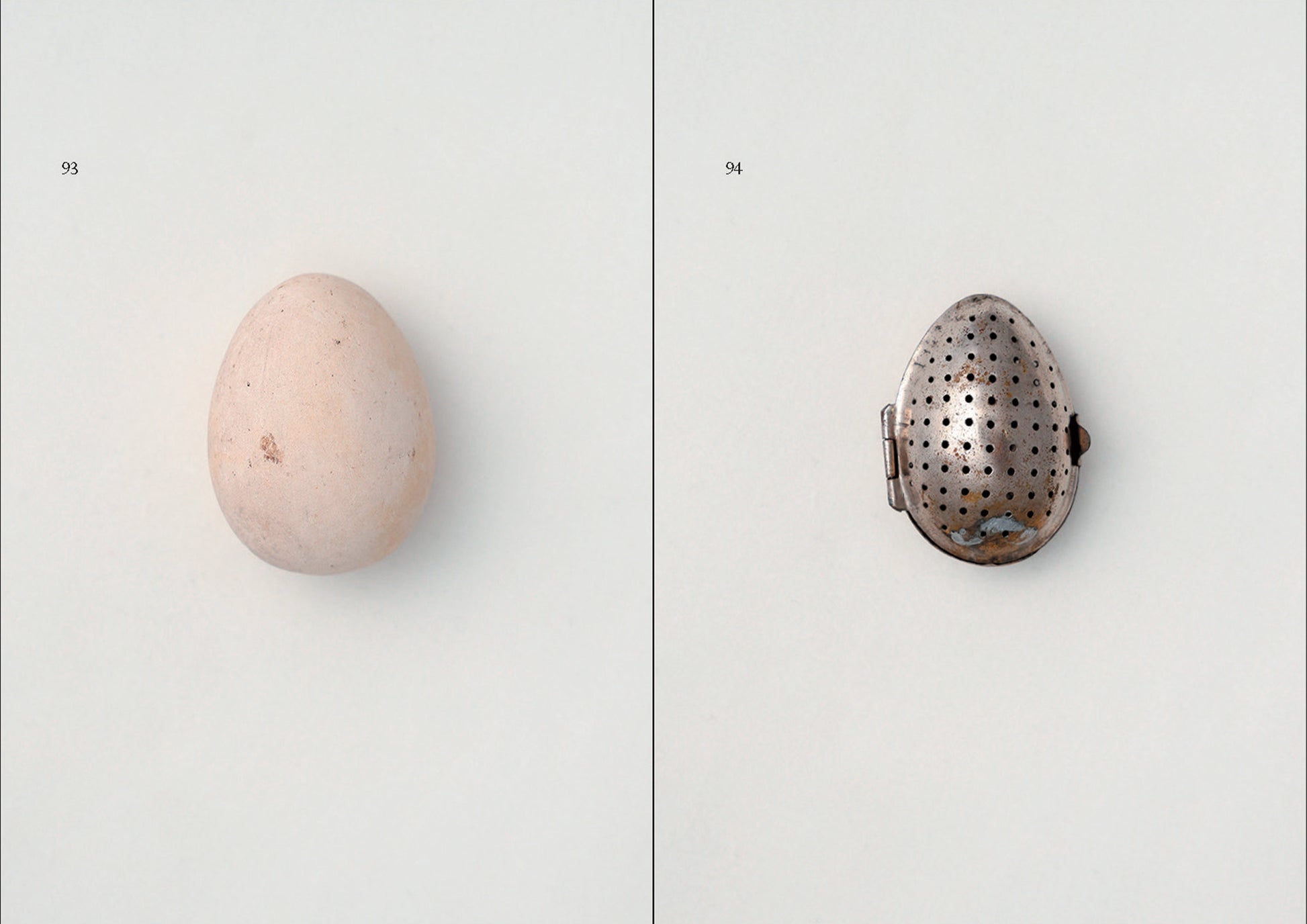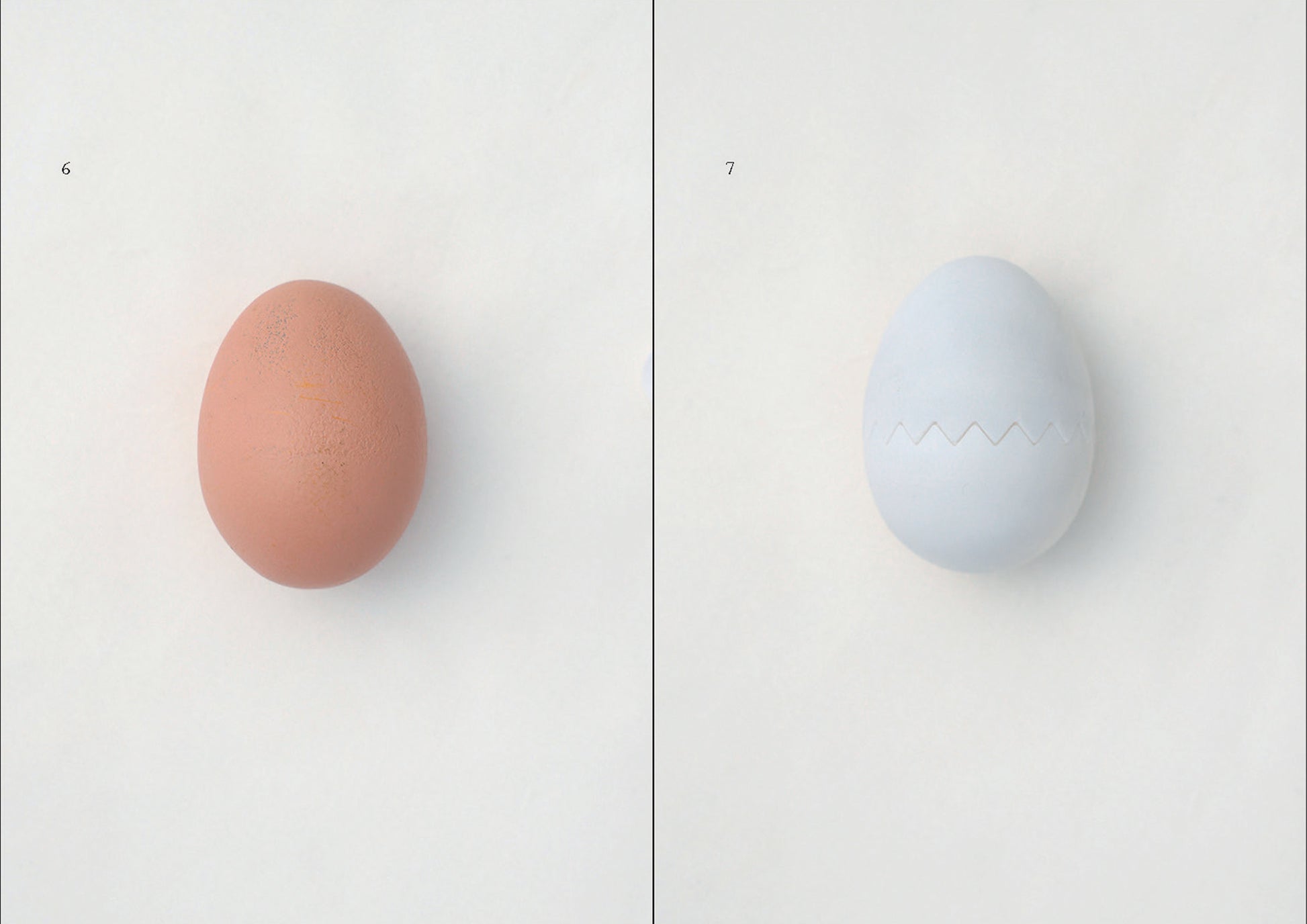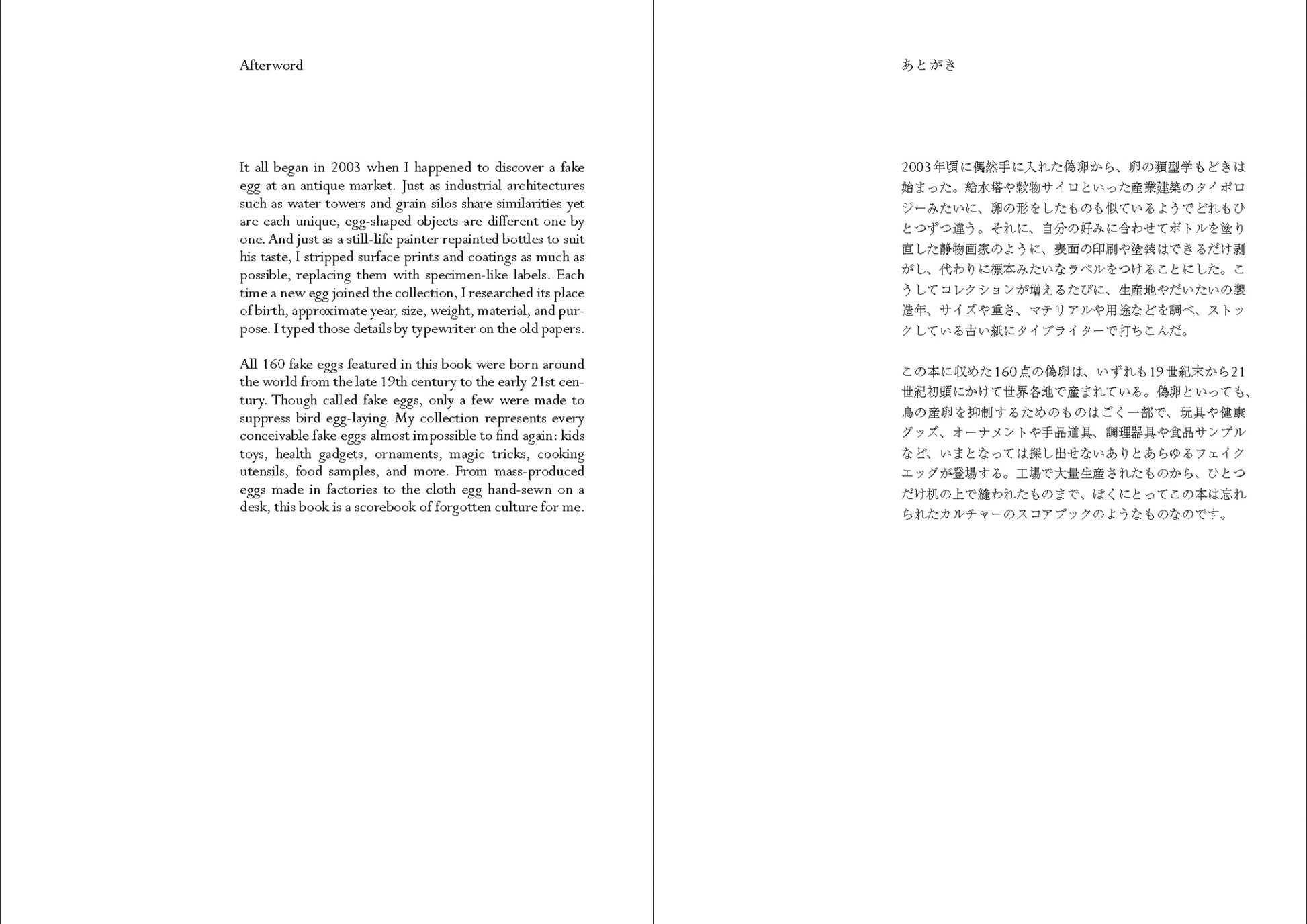 この本に収めた160点の偽卵は、いずれも19世紀末から21世紀初頭にかけて世界各地で産まれている。偽卵といっても、鳥の産卵を抑制するためのものはごく一部で、玩具や健康グッズ、オーナメントや手品道具、調理器具や食品サンプルなど、いまとなっては探し出せないありとあらゆるフェイクエッグが登場する。工場で大量生産されたものから、ひとつだけ机の上で縫われたものまで、ぼくにとってこの本は忘れられたカルチャーのスコアブックのようなものなのです。 (本書あとがきより)